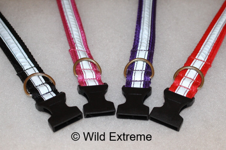 This is our standard webbing collar with a strip of very high reflective tape sewn down the middle.